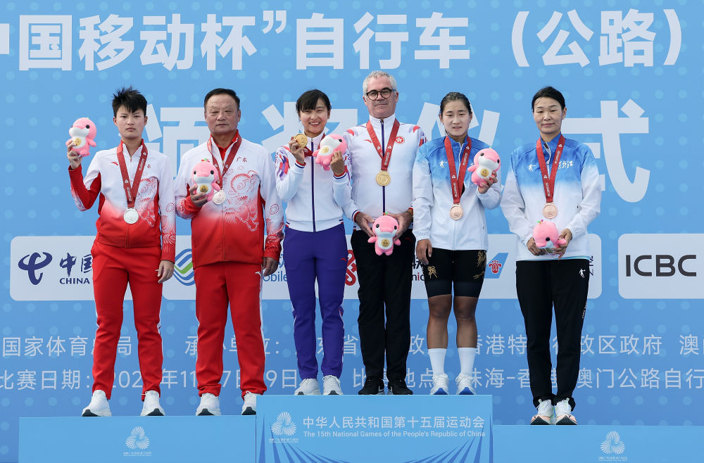 新华社珠海11月9日电(记者田宇)第十五届全运会公路自行车赛9日在珠海落下帷幕。香港队李思意在女子个人赛中成功卫冕。 11月9日,香港队团体冠军李思义(左三)、广东队亚军韦晓庆(左)、黑龙江队团体季军冯林(右二)与教练员在颁奖典礼上合影。新华社记者毛思前摄,97名运动员在总里程138.7公里的赛道上展开角逐。起点和终点位于珠海市博物馆和规划中心前的广场,主要经过珠海市横琴粤澳深度合作区内的情侣路。当天珠海天气晴朗,比赛继续进行,8日男子个人赛的精彩场面当大群冲过终点线时。最终,44人全部成绩为3小时19分54秒。李思义以微弱优势夺得冠军。广东队韦晓庆和黑龙江队冯林分别获得银牌和铜牌。 11月9日,香港队球员李思义(前左二)冲线后庆祝。新华社记者 连震 摄 “今天我很高兴,赛前教练总是相信我,甚至比我相信自己还要多。”李思意说,“现在比赛最后阶段,五个人一组崩溃了,甚至拉了20多秒。对我们来说,那一刻的危机感是相当大的。这完全归功于我的同事们牺牲了所有的精力来帮助我追赶。今天的成绩,我非常感谢教练和团队里每个人的配合。”李思意表示参加今年举办的全运会很有意义广东、香港、澳门。谈及全运会历史上首次跨界比赛男子个人比赛,他直言“很羡慕男运动员有这个机会”,也期待未来有机会参加跨越粤港澳的比赛。至此,本次全运会公路自行车比赛圆满结束。四枚金牌中,山东队包揽了男子项目的全部两枚金牌,女子项目的两枚金牌分别属于海南队和香港队。