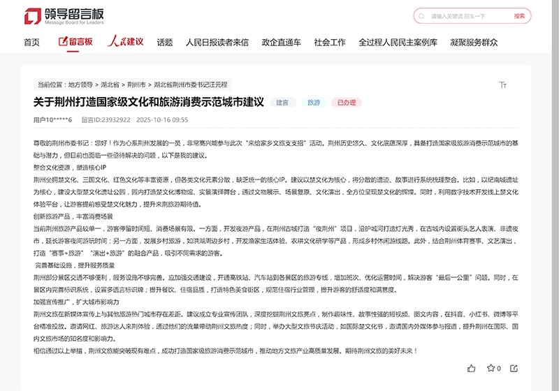 人民网武汉11月22日电(记者王国吉)旅游是城市活力的体现,是人民美好生活的重要组成部分。近日,有网友通过“人民在线建言”留言,为家乡荆州打造国家级文化消费和旅游典范建言献策。他深入分析了荆州在文化资源整合、旅游产品创新、基础设施和宣传推广等方面面临的机遇和挑战,期望荆州文化旅游突破瓶颈,实现高质量发展。 “人民网上领导留言板截图“建议以楚文化为核心,系统整合文化节庆活动,扩大城市影响力。”该网友解释道。荆州市文化和旅游局收到留言后回复:“建议符合实际。”回应中还透露,荆州文化和旅游发展取得了积极进展,如入选国家文化和旅游试点城市、位居全国中小城市美食旅游名录第一名、第二届楚文化节即将成功举办等。荆州市文化和旅游局在截图回应中还公开指出,承认目前旅游文化和发展的考虑正在进行对于网友留言中提到的“旅游产品单一、游客停留时间短、消费情况有限”等问题,要统筹考虑、推广和系列吸收重要意见。d荆州的做法反映同频。以消息中强调的“夜游产品”为例,荆州“夜经济”加速布局。 2025年国庆假期期间,荆州的古灯灯光秀、护城河彩灯秀等夜游将吸引众多游客。城市街区举办的各类文博会、街头表演,有效延长了游客停留时间,丰富了游客消费体验。据统计,2025年国庆、中秋假期期间,荆州共接待游客791.6万人次,成为不少游客的首选地。这一著名现象的背后,是荆州不断整合文化资源、创造消费新局面、提升服务质量的结果。从高标准举办楚文化节打造重点IP,到体育赛事与文艺演出结合打造一体化产品、优化交通和旅游服务,网友建议中的很多想法在荆州文化旅游发展中清晰可见。